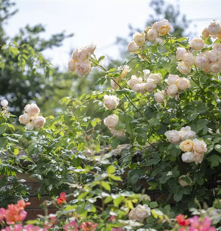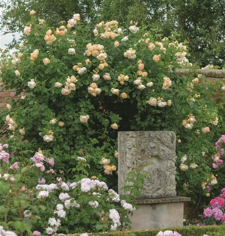 Mit einer Höhe von etwa 150 bis 380 cm wächst die Wollerton Old Hall® aufrecht und gut verzweigt. Sie lässt sich hervorragend an Pergolen, Rosenbögen, Spalieren oder Fassaden ziehen und bringt romantischen englischen Gartencharme in jede Gartenanlage.