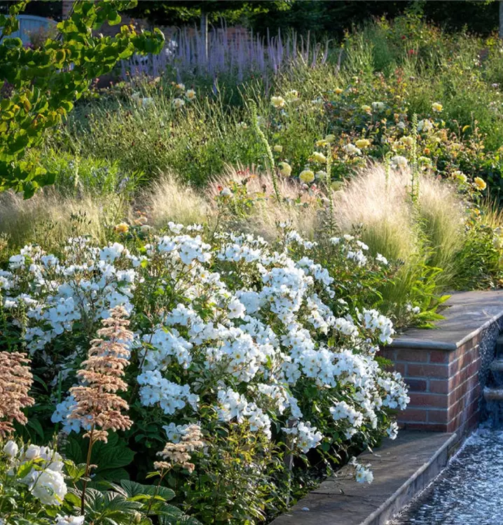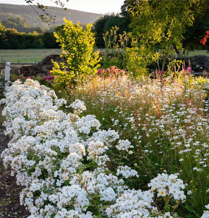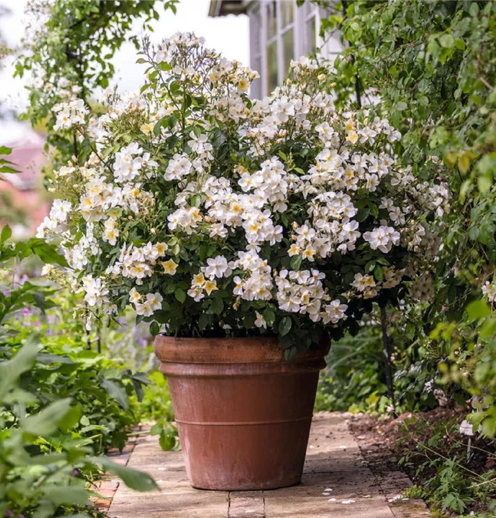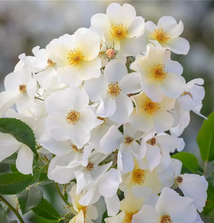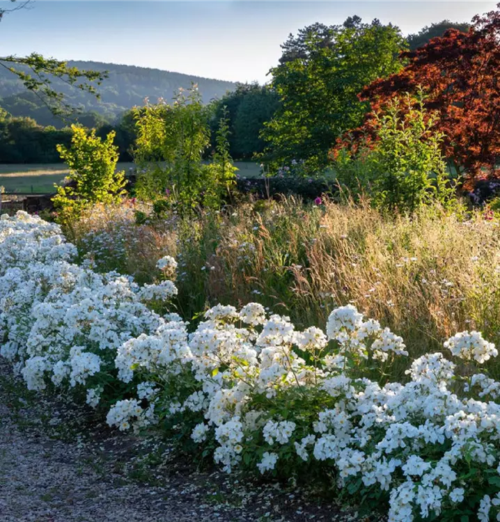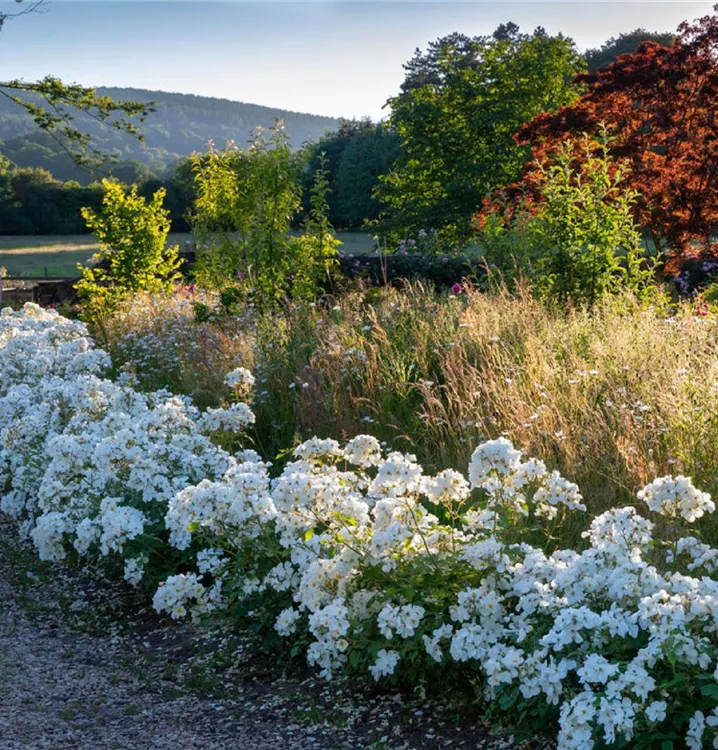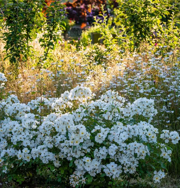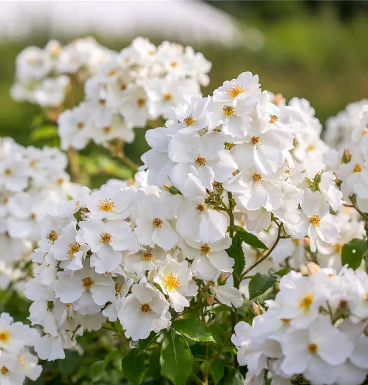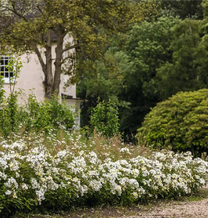 Kew Gardens wirkt wie ein sommerlicher Blütenschleier im Garten. Unzählige einfache, reinweisse Blüten mit goldgelben Staubgefässen erscheinen in grossen Dolden und verleihen der Rose eine luftige, fast wilde Eleganz. Ein feiner, leichter Duft begleitet die reiche Blüte und unterstreicht ihren natürlichen Charakter.