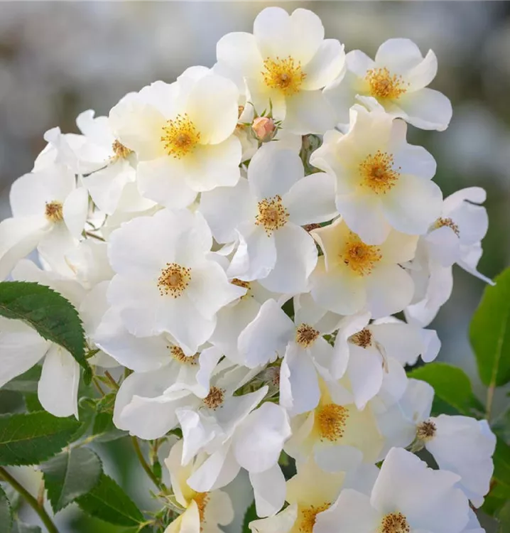 Blüte: weisse Blütenblätter mit zitronengelben Staubgefässen – einfach. Pflanze: aufrecht wachsend – nahezu stachellos – gesund – 120 bis 150 cm hoch.