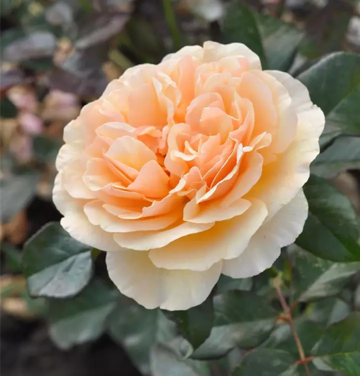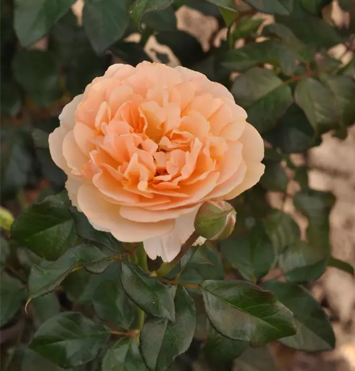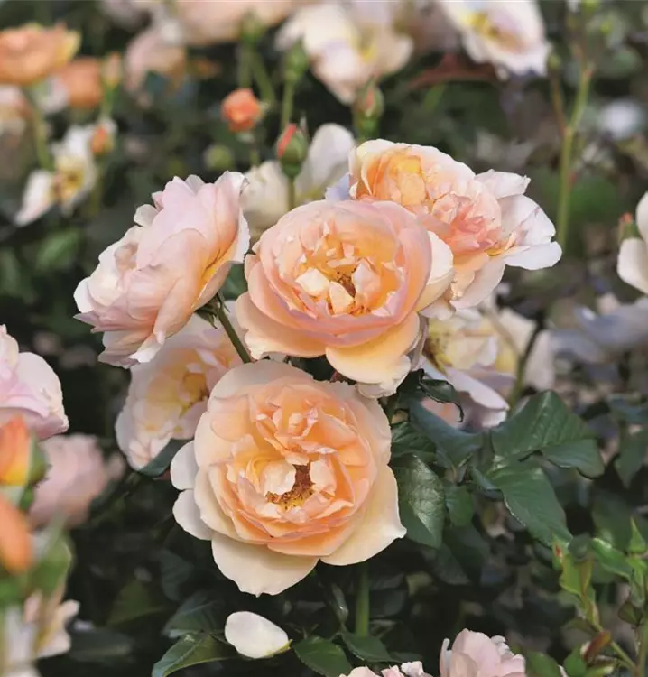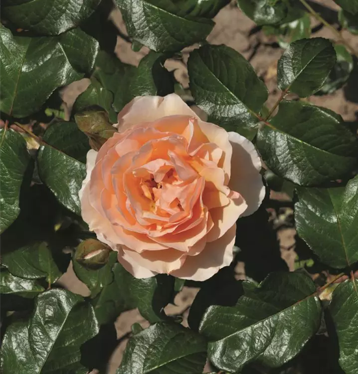Blüte: zartorange - grossblumig, 8 bis 9 cm Durchmesser – durchschnittlich 47 Blütenblätter – süsser, fruchtiger Duft. Pflanze: starke, aufrechte Zweige – starke, aufrechte Zweige – krankheitsresistent.