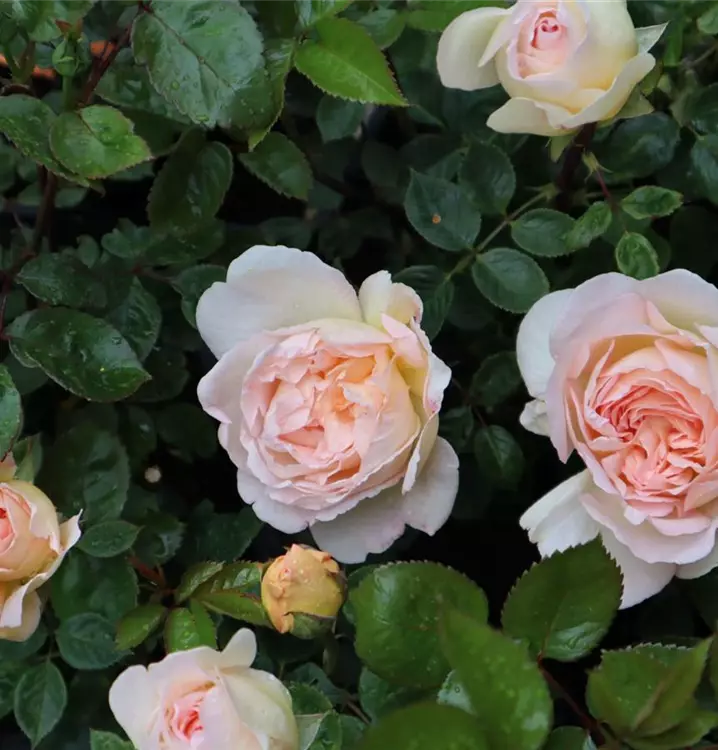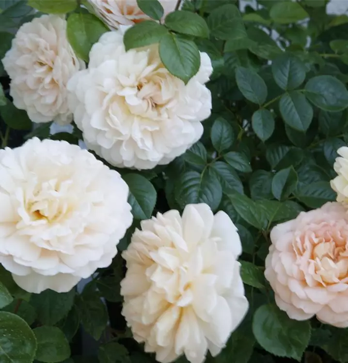 Diese Floribundarose wächst buschig und aufrecht mit einer Wuchshöhe von ca. 70–90 cm und einer Breite von etwa 60 cm. Von Juni bis Oktober zeigt sie eine gute Nachblüte. Das dunkelgrüne Laub wirkt gepflegt und bildet einen schönen Kontrast zu den zarten Blüten.