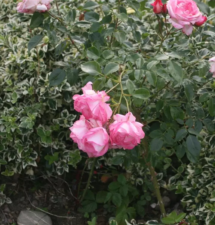 Die Kletterrose Harlekin® begeistert mit grossen, dicht gefuellten Blüten in Cremeweiss mit dekorativen rötlichen Blütenrändern. Dieses elegante Farbspiel verleiht der Rose eine besonders lebendige und dekorative Ausstrahlung. Die Blüten erscheinen in kleinen Büscheln und verleihen Rosenbögen, Pergolen oder Hausfassaden eine romantische und ausdrucksstarke Wirkung.