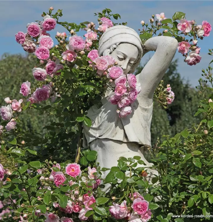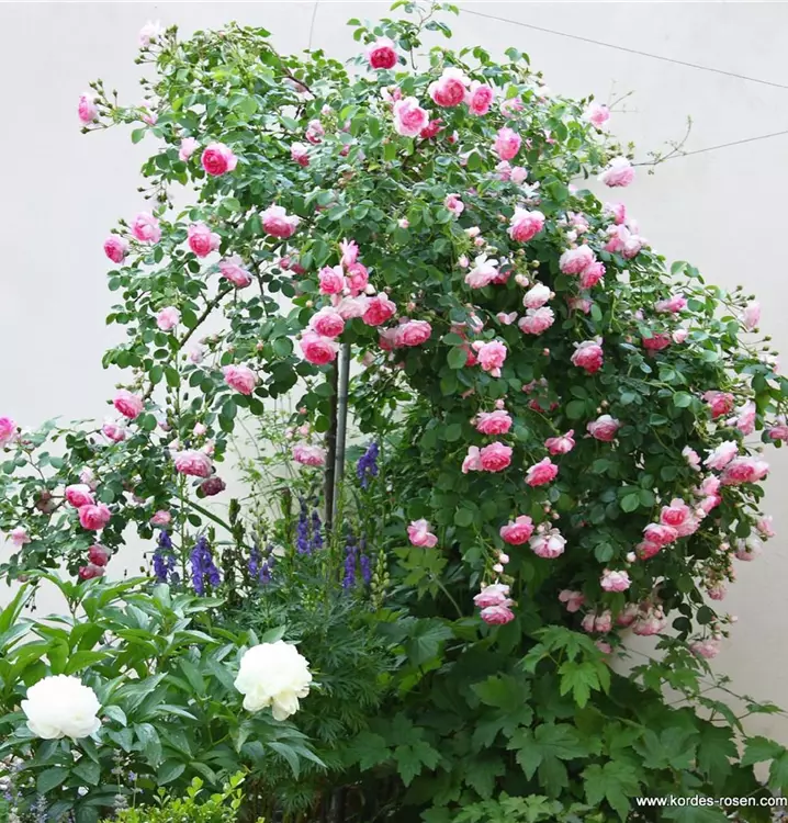 Diese Kletterrose wächst kräftig und bildet lange, elegante Triebe mit gesundem, dunkelgrünem Laub. Mit einer Wuchshöhe von etwa 250–300 cm und einer Breite von rund 100–150 cm eignet sie sich hervorragend für Rankhilfen im Garten. Die dicht gefuellten Blüten erscheinen über den Sommer hinweg in mehreren Blühschüben und verströmen einen intensiven, angenehmen Rosenduft.