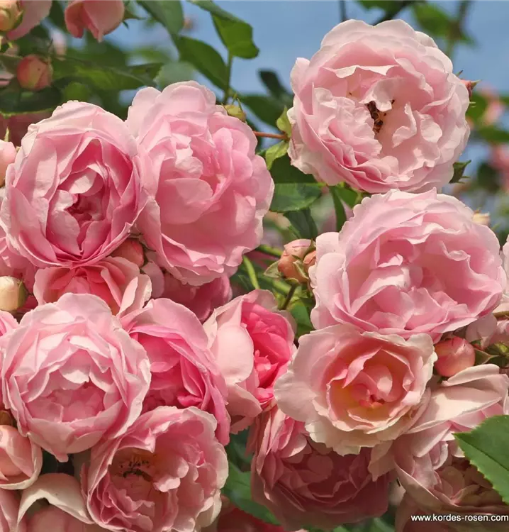Die Kletterrose Jasmina® begeistert mit zahlreichen, dicht gefuellten Blüten in einem besonderen Farbton zwischen Rosa und Violett. Die nostalgisch geformten Blüten erscheinen in grossen Büscheln und verleihen Rosenbögen, Pergolen oder Hausfassaden eine besonders romantische und elegante Ausstrahlung. Während der Blütezeit entsteht ein üppiges Blütenbild, das den Garten in ein weiches und harmonisches Farbspiel taucht.
