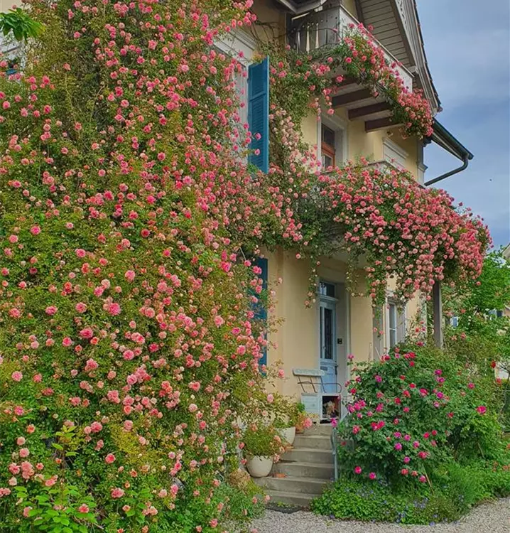 Die Kletterrose Paul Noël verzaubert mit ihren zart lachsrosa Blüten, die von sanften gelblichen Schattierungen durchzogen sind. Ihre nostalgisch wirkenden Blüten erscheinen in kleinen Büscheln und verleihen Pergolen, Rosenbögen oder Spalieren eine besonders romantische Ausstrahlung. Der intensive Rosenduft erfüllt den Garten während der Blütezeit mit einer angenehmen, klassischen Duftnote.
