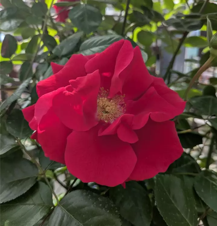 Die Kletterrose Santana überzeugt mit ihren intensiven, leuchtend roten Blüten, die sofort ins Auge fallen. In grossen Blütendolden erscheinen sie an kräftigen Trieben und verleihen Pergolen, Rosenbögen oder Fassaden eine besonders elegante und kraftvolle Ausstrahlung. Diese Sorte bringt klassische Rosenromantik und starke Farbakzente in jeden Garten.