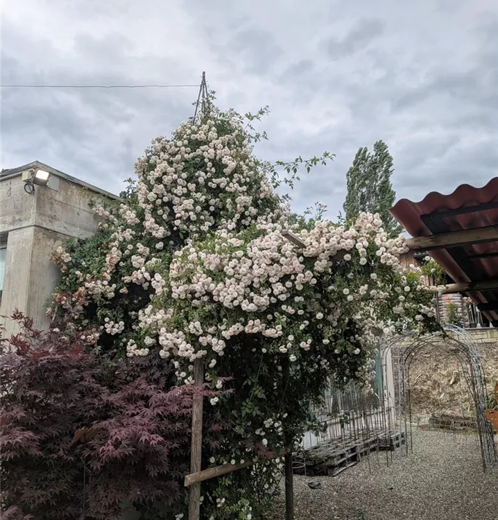 Die Ramblerrose Félicité et Perpétué entfaltet im Juni ein wahres Blütenmeer aus dicht gefüllten, kleinen weissen Rosenblüten mit zartrosa Knospen. Wie ein Schleier aus antiken Perlen hängen die Blütendolden schwer an langen Trieben und verströmen leichten Duft. Diese historische Schönheit bringt zeitlose Eleganz in grosse Gärten – ideal für Rosenliebhaber, die den Charme vergangener Zeiten schätzen.