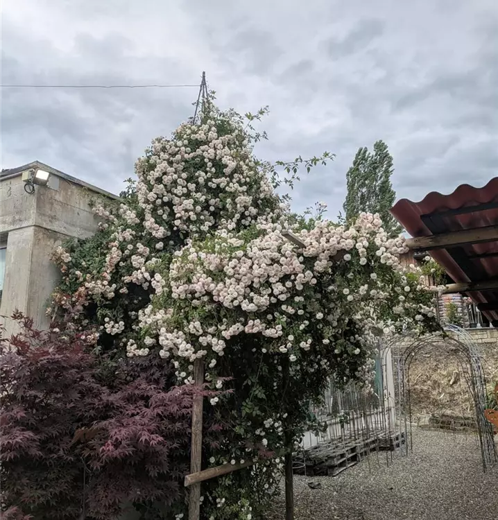 Die Rose wächst kräftig und schlingend bis zu 5–6 Meter hoch und benötigt eine stabile Kletterhilfe wie Bögen, Pergolen oder hohe Zäune. Ihre Triebe sind nahezu stachellos und lassen sich gut leiten. Die Belaubung ist glänzend dunkelgrün und sehr gesund, was die Pflanze auch ausserhalb der Blütezeit attraktiv macht. Als typische Ramblerrose blüht sie einmal im Frühsommer, dafür aber umso üppiger.