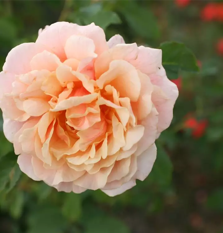 Die grossen Blüten erreichen etwa 10 cm Durchmesser und bestehen aus über 40 Blütenblättern. Ihre geviertelte, rosettenartige Form erinnert an historische Rosen und wirkt besonders edel. Der Duft ist leicht bis kaum wahrnehmbar. Das mittelgrüne, leicht glänzende Laub sorgt für einen harmonischen Kontrast und unterstreicht die gesunde, kräftige Erscheinung der Pflanze.
