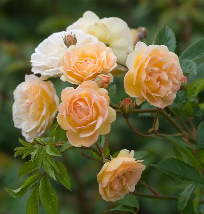 Die Strauchrose Ghislaine de Féligonde ist wie ein Spaziergang durch einen verwunschenen Park. Ihre kleinen, gefüllten Blüten tanzen in Farbnuancen von warmem Apricot bis zartem Cremeweiss – manchmal mit einem Hauch Rosa. Sie blüht überreich, fast verschwenderisch, und verströmt dabei einen angenehmen, fruchtigen Duft. Ein zauberhaftes Erlebnis für alle Sinne.