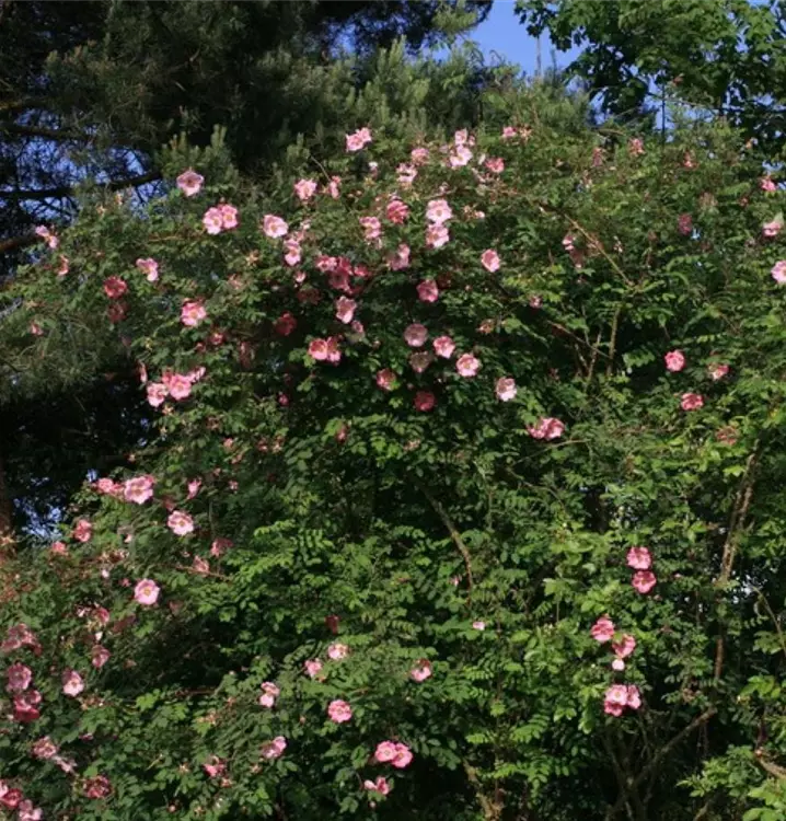 Diese bezaubernde Wildrose wächst bis zu 2 Meter hoch und zeigt im Hochsommer ihre volle Blütenpracht. Besonders auffällig sind die grossen, leuchtend roten Hagebutten, die im Herbst farbige Akzente setzen und Vögeln wie Menschen Freude bereiten. Ihre robuste Natur macht sie ideal für naturnahe Pflanzungen.