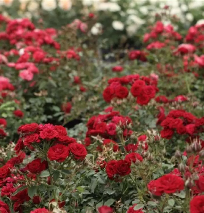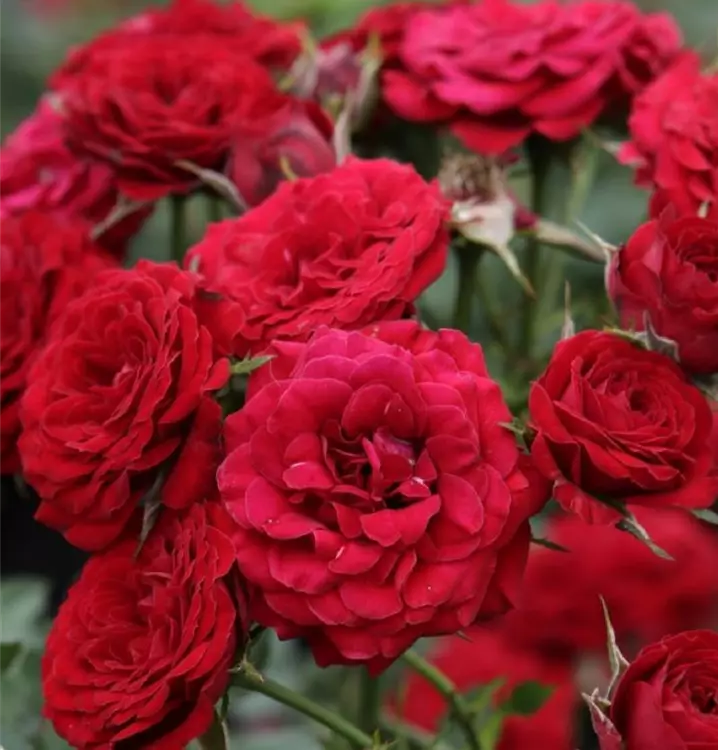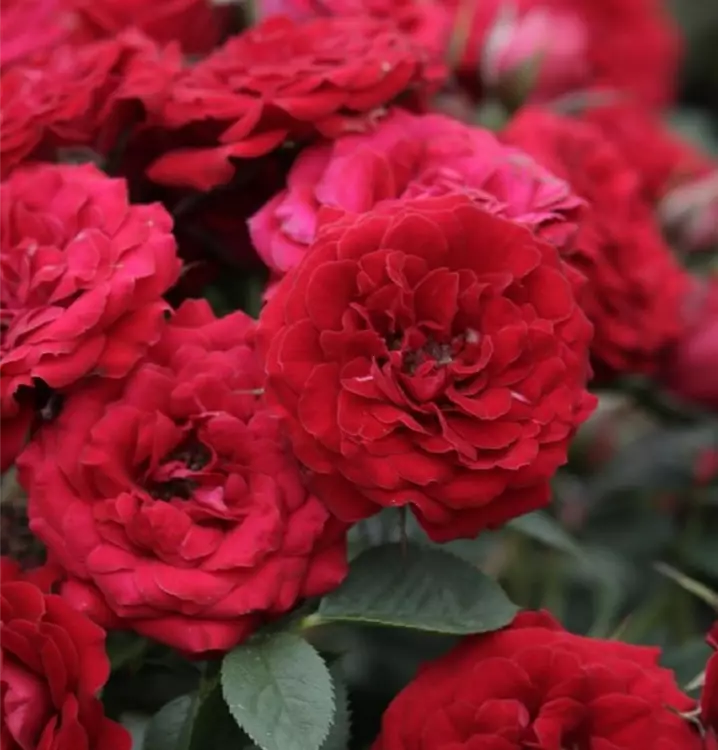 Kleine, gut gefüllte, samtig dunkelrote Blüten in grossen Dolden. Kompakter Wuchs. Überreich- und dauerblühende Zwergrose.