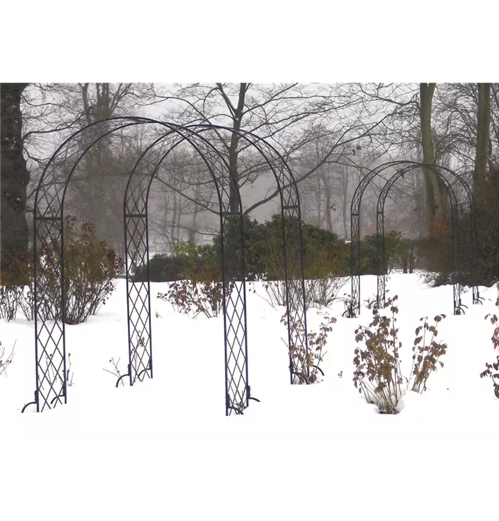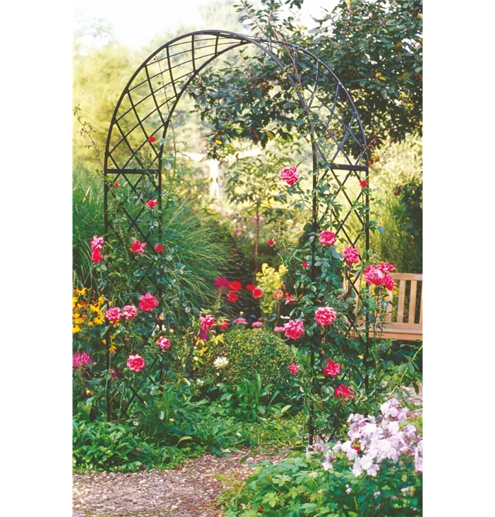 Mit Leichtigkeit tragen diese klassischen Rosenbögen aus Eisen die schwere Pracht der Blüten. Hintereinander gestaffelt formieren sie sich zu romantischen Laubengängen, an deren Ende eine Statue, eine Bank oder vielleicht ein Brunnen grüsst. Breite und Höhe sind so grosszügig bemessen, dass auch unter der wuchernden frühsommerlichen Rosenfülle reichlich Kopffreiheit bleibt. Waagerecht oder zumindest schräg angebundene Kletterrosentriebe verzweigen sich übrigens deutlich besser und blühen üppiger. Nutzen sie also die Tiefe dieses Klettergerüstes aus.