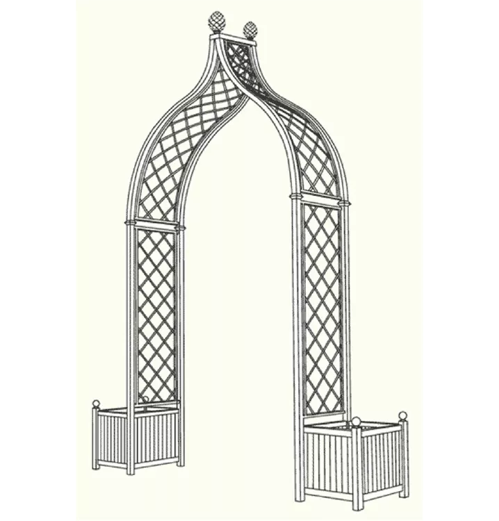 Diese schweren, freistehenden Rosenbögen prunken mit einer seit dem "fin de siècle" nicht mehr erreichten Kunst der Verarbeitung. Ihre leicht geschwungene Form erinnert an gotische Fensterbögen. Dieser Stil war zu Zeiten Königin Victorias höchst populär. Noch heute finden sich im südenglischen Seebad Brighton die schönsten Beispiele dieser Architektur.