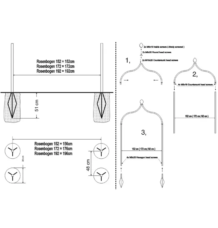 Aufgrund der Konstruktion und des Gewichtes der beiden Pflanzkübel benötigt dieser Bogen keine Verankerung. Beide Pflanzkübel je 44 x 52 x 51 cm werden mit einem herausnehmbaren Pflanzeinsatz aus Plastik geliefert.
