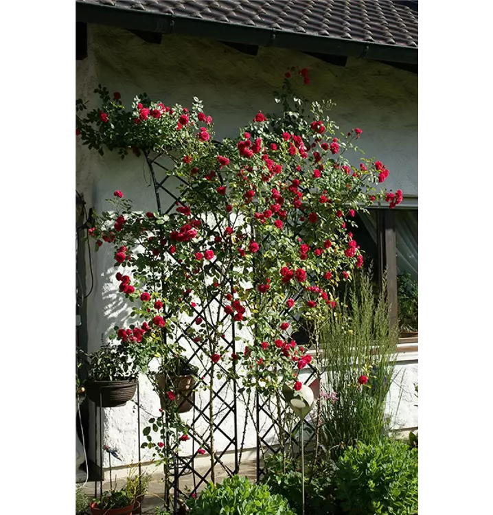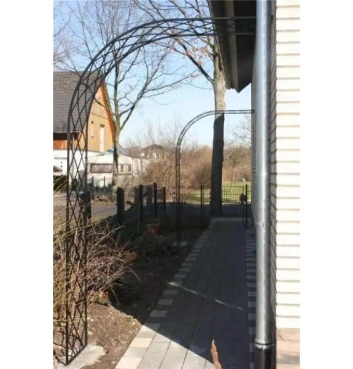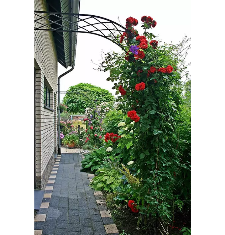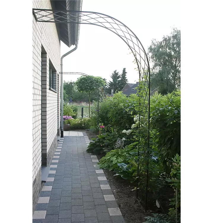Schlicht, jedoch elegant und klassisch in der Form präsentiert sich unser Rosenhalbbogen Bagatelle. Eminent praktisch schafft er Abhilfe für eine typische schwierige "Gartenecke": Gärtnerisch ist die Situation direkt am Haus ja häufig gekennzeichnet von Trockenheit aufgrund des Regenschattens, schlechter Erde gemischt mit altem Bauschutt und viel zu wenig Raum, da sich hier Gehweg und Rabatte den kleinen Raum zwischen Haus und Grundstücksgrenze teilen müssen. Der Rosenhalbbogen Bagatelle verleiht dem schmalen Weg entlang des Hauses Farbe und Duft in der Höhe. Kletterpflanzen, vor allem Rosen und Clematis, wurzeln und gedeihen in deutlicher Entfernung zum Haus ausserhalb des Regenschattens besser und blühen üppiger. Der Rosenhalbbogen Bagatelle ist zudem beliebig erweiterbar. Hintereinander gestaffelt formieren mehrere Halbbögen einen romantischen Wandelgang direkt am Haus.