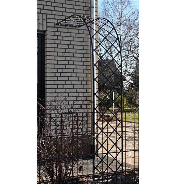 Rahmen aus 1,5 cm Stahlprofilrohr, Geflecht aus 1,5 cm Stahlband, feuerverzinkt und pulverbeschichtet in schwarz. Andere Farben und Sondermasse auf Anfrage. Der Rosenhalbbogen Bagatelle wird an der Hausseite direkt an die Wand verdübelt und auf der Gartenseite mit vier Ankern in Beton gesetzt. Gearbeitet in einem Stück.