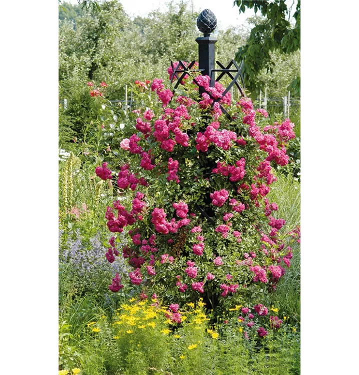 Romantische, alte Rosen wachsen oft ungestüm in viele Richtungen und die Sträucher schauen dann leicht etwas ungepflegt, zerfleddert aus. Mit dieser aussergewöhnlichen Rosensäule aus Charleston bewahren die in voller Blütenpracht sehr schweren Zweige eine kompakte Form. Die schrägen Stahlbänder der Säule Charleston führen die Haupttriebe nur langsam nach oben. Sie regen damit die Rosen zur Bildung neuer, knospender Seitentriebe an. Dieses Gestaltungsprinzip stammt aus der traditionsreichen Rosenstadt Charleston, South Carolina, dort, wo 1819 die ersten Noisette Rosensorten entstanden.