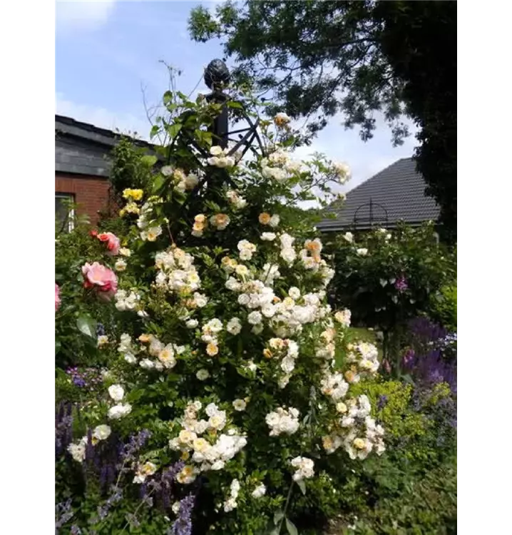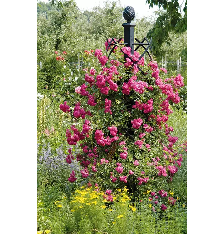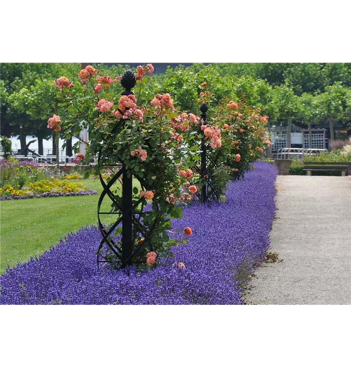 Romantische, alte Rosen wachsen oft ungestüm in viele Richtungen und die Sträucher schauen dann leicht etwas ungepflegt, zerfleddert aus. Mit dieser aussergewöhnlichen Rosensäule aus Charleston bewahren die in voller Blütenpracht sehr schweren Zweige eine kompakte Form. Die schrägen Stahlbänder der Säule Charleston führen die Haupttriebe nur langsam nach oben. Sie regen damit die Rosen zur Bildung neuer, knospender Seitentriebe an. Dieses Gestaltungsprinzip stammt aus der traditionsreichen Rosenstadt Charleston, South Carolina, dort, wo 1819 die ersten Noisette Rosensorten entstanden.