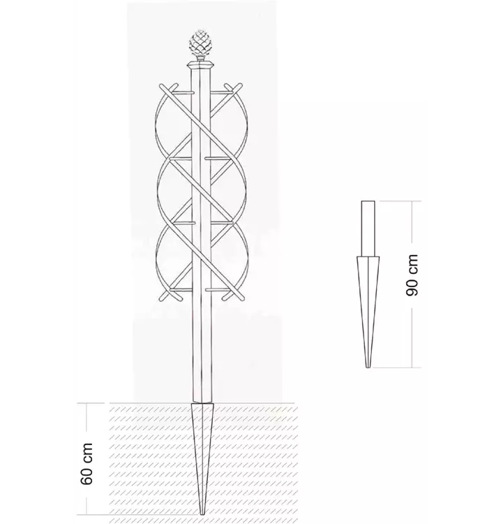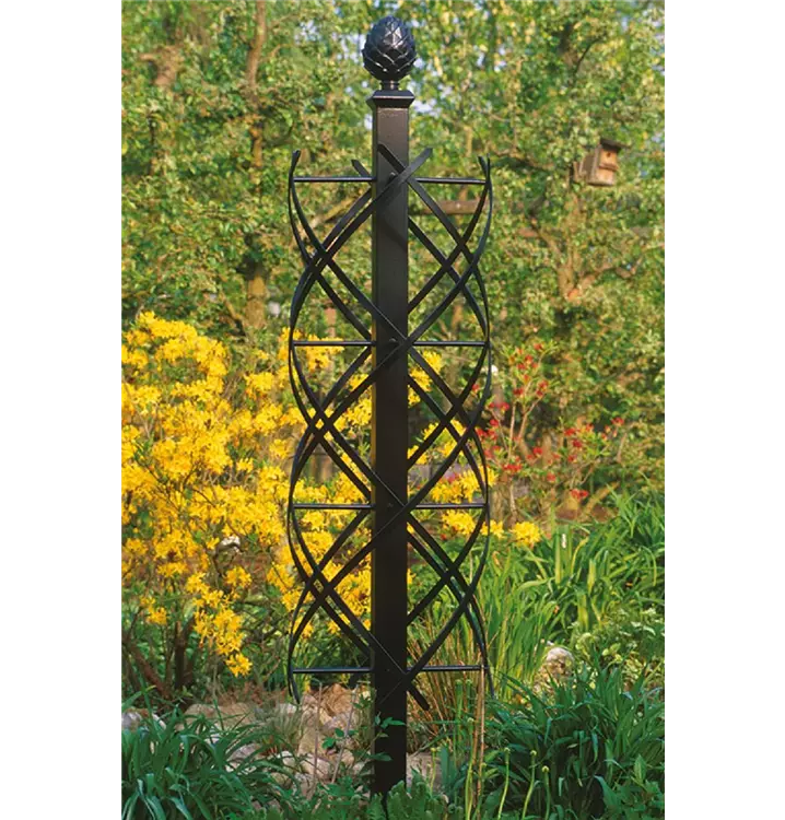 Pfosten aus 8 cm Stahlprofilrohr, Spiralengeflecht aus 2 cm Stahlband, feuerverzinkt und pulverbeschichtet in schwarz. Andere Farben auf Anfrage. Für den sicheren Stand wird ein 60 cm langen Bodenanker mitgeliefert. Dieser ist in Beton zu verankern.
