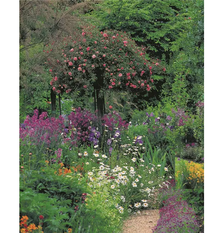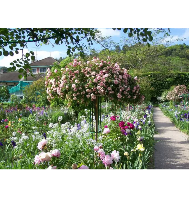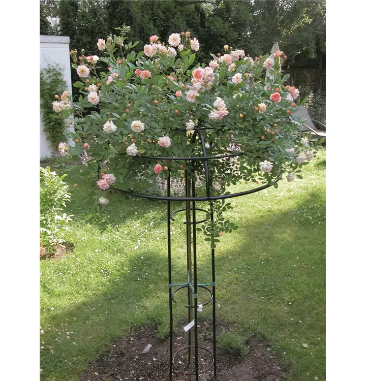 In üppigen Kaskaden fallen die Rosen in Giverny über diesen eisernen Schirm. Claude Monets Erfindung, schlicht und vollkommen zugleich, lässt jede Trauerstammrose zu einem prachtvollen impressionistischen Gemälde aufblühen. Die langen, weichen, überhängenden Triebe von Trauerstammrosen, auch Kaskadenstammrosen genannt, brechen bei Wind oft ab. Zur Entfaltung ihrer Blütenpracht benötigen sie daher eine besonders stabile Stütze, der auch ein Sturm nichts anhaben kann.