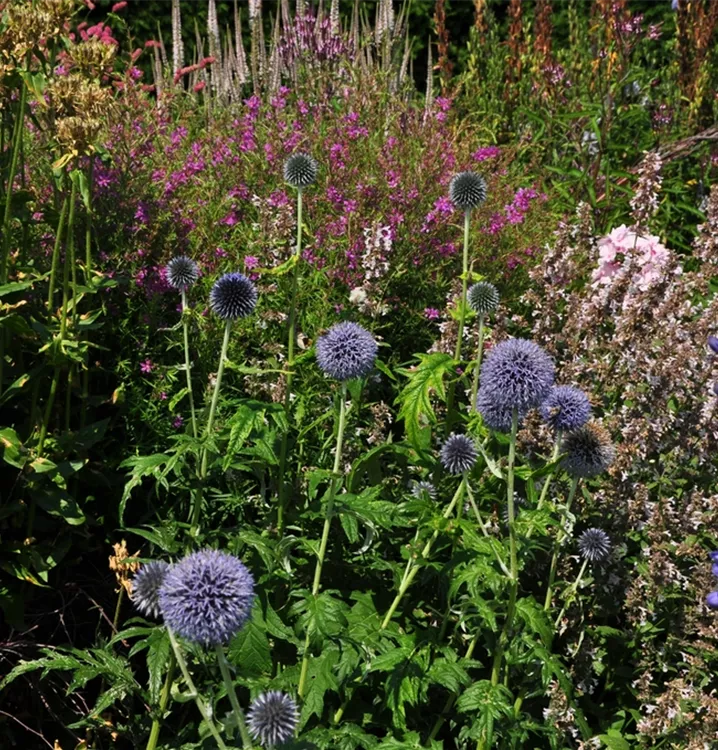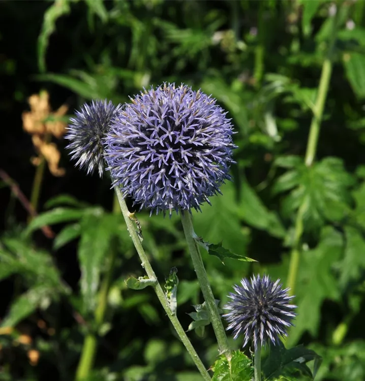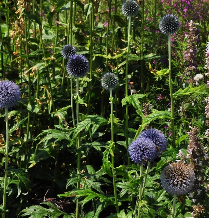 Stahlblaue Blütenköpfe kugelig auf verzweigten